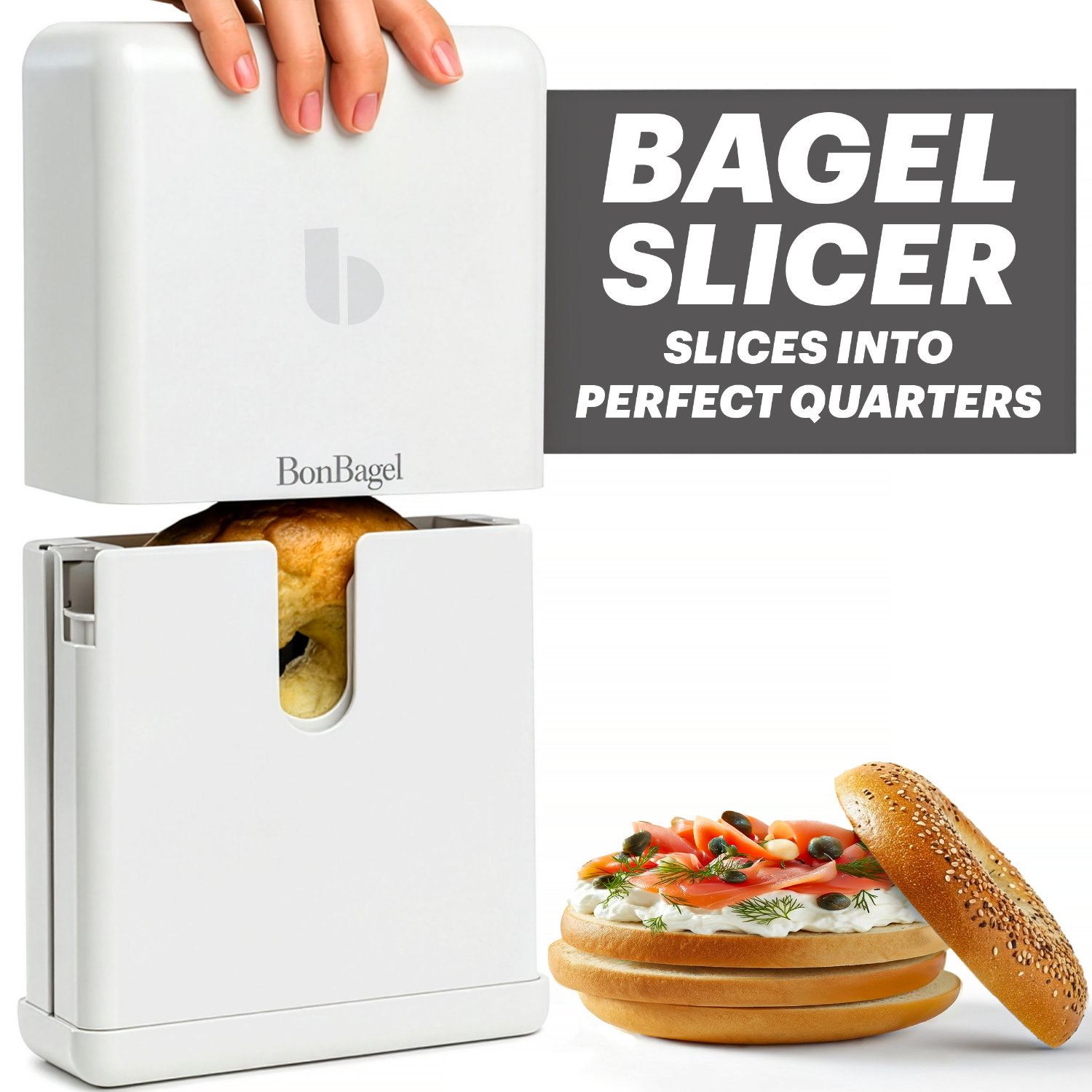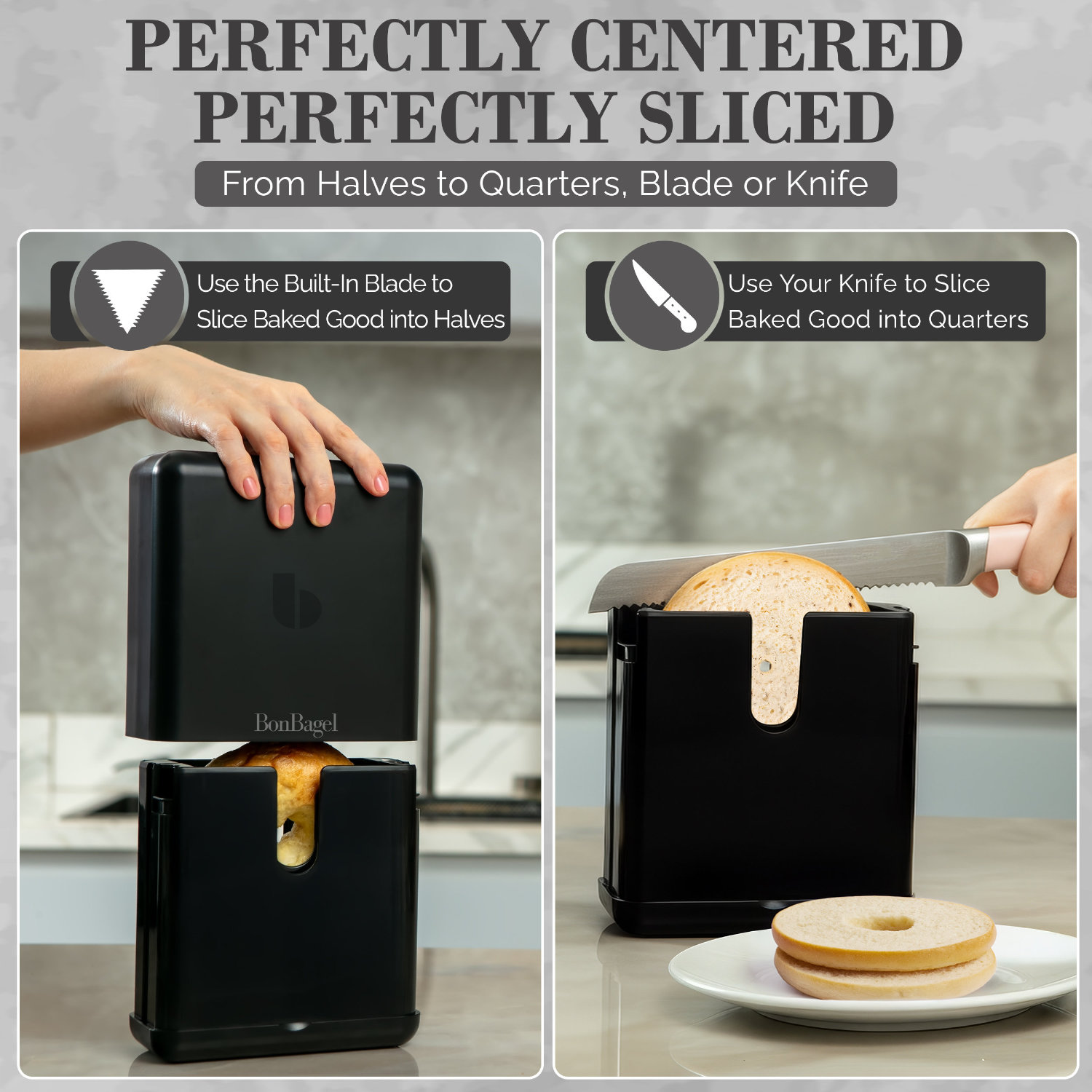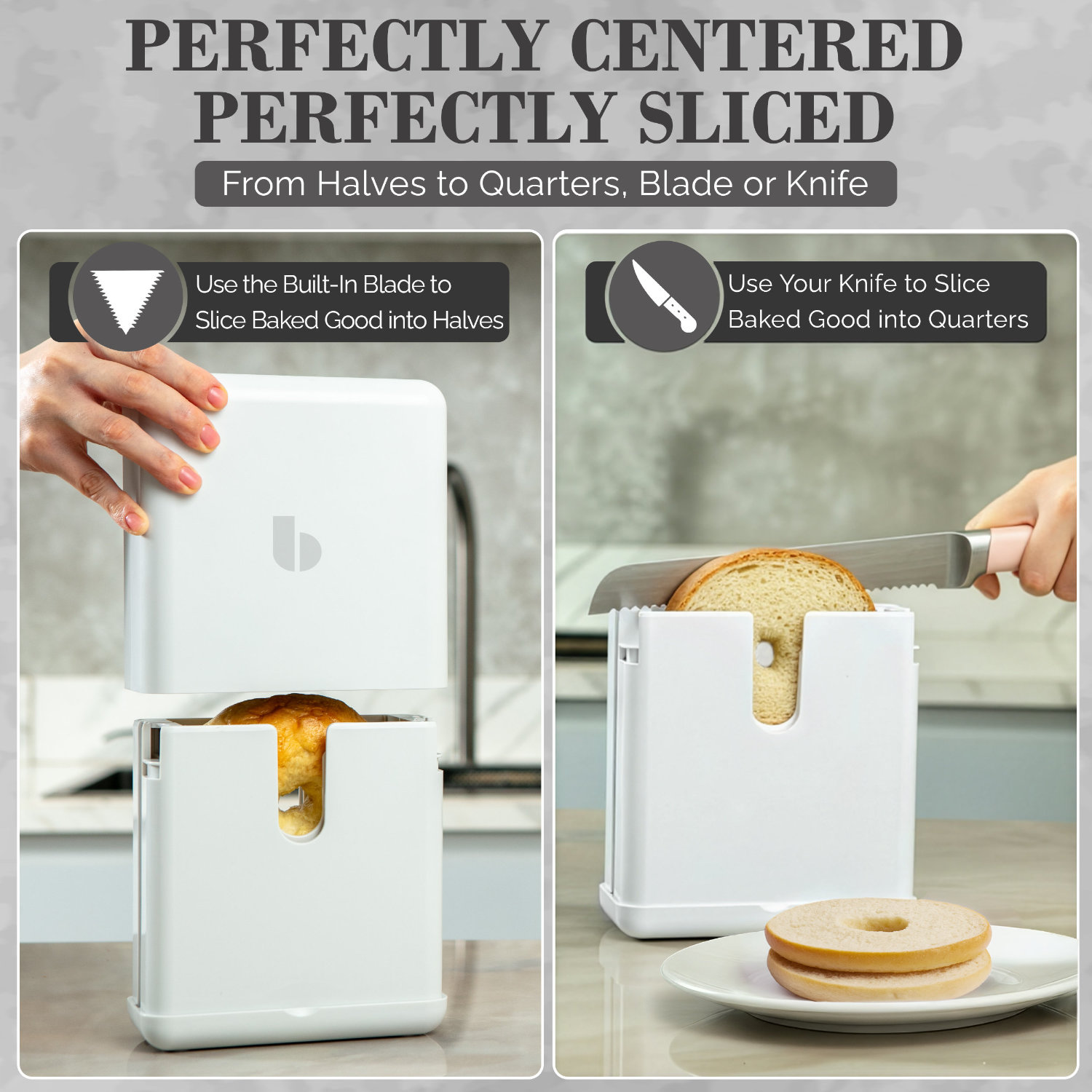 Unlike guillotine-style models that can crush or misalign bread, our slicer combines reliable centering with the option to use the built-in blade or your own kitchen knife. That flexibility means you can cut bagels into neat halves or even create four thinner slices for sandwiches and snacks. The result is clean edges without the mess or uneven cuts that often come from using a standard knife.